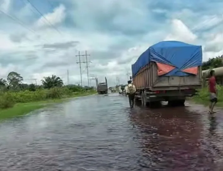 Kondisi tersebut menyebabkan genangan tidak hanya menutup badan jalan, tetapi juga masuk ke halaman hingga permukiman warga.