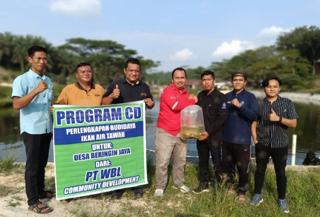 Di Desa Beringin Jaya, PT WBL menyalurkan bantuan kepada dua kelompok usaha sekaligus. Kelompok Mekar Jaya yang dipimpin Muhammad Sholihin menerima 2.000 ekor bibit ikan mas, lengkap dengan jaring karamba serta pakan pendukung.