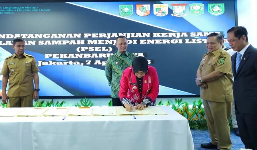 SIAK, FOKUSRIAU.COM-Pemerintah daerah di Riau resmi melangkah ke fase baru pengelolaan sampah. Sejumlah kepala daerah menandatangani nota kesepahaman (MoU) proyek Pengolahan Sampah menjadi Energi Listrik (PSEL) aglomerasi Pekanbaru Raya, Senin (6/4/2026) di Jakarta.