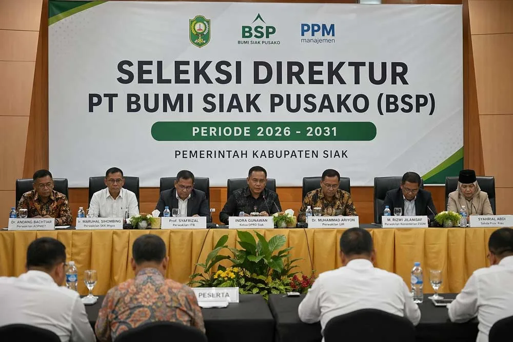 PEKANBARU, FOKUSRIAU.COM-Proses seleksi Direktur PT Bumi Siak Pusako (BSP) periode 2026–2031 mencuri perhatian nasional. Pemerintah Kabupaten Siak menerapkan mekanisme seleksi terbuka dengan melibatkan tujuh penguji, jumlah yang dinilai melampaui standar umum dan mendapat apresiasi dari pihak kementerian.
