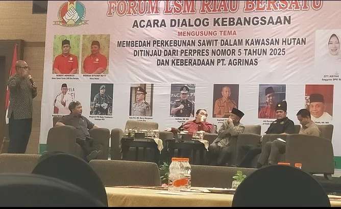PEKANBARU, FOKUSRIAU.COM-Forum LSM Riau Bersatu menggelar dialog kebangsaan bertema “Membedah Perkebunan Sawit dalam Kawasan Hutan Ditinjau dari Perpres No 5 Tahun 2025 dan Keberadaan PT Agrinas”, Kamis (4/12/2025) di Hotel Pangeran Pekanbaru.