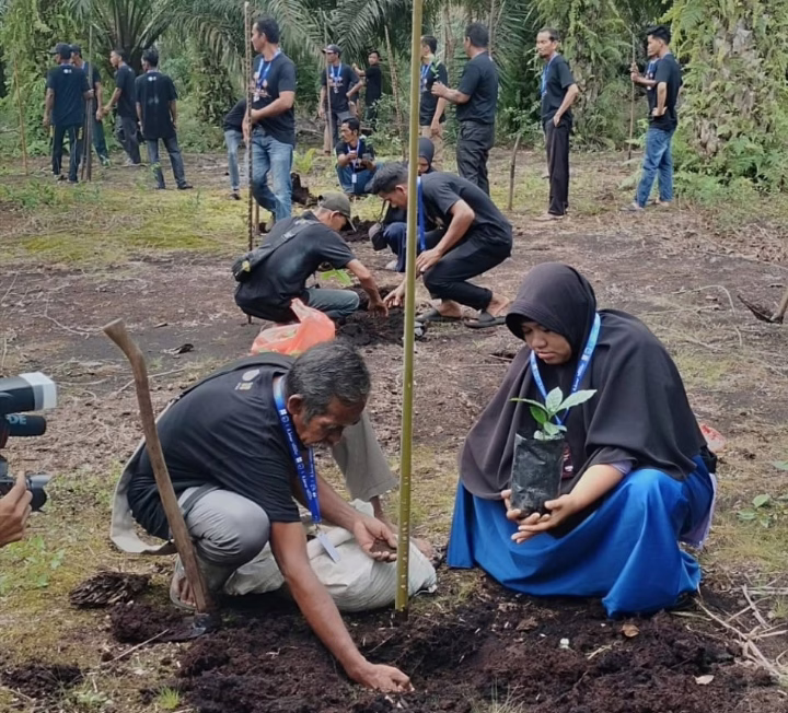 Di sela rimbunan pohon sawit yang menjulang, sekelompok orang tampak sibuk menggenggam cangkul, mengukur jarak tanam, dan menggali lubang di tanah hitam pekat.