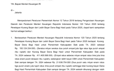 SIAK, FOKUSRIAU.COM-Bupati Siak Afni Zulkifli, menyurati Menteri Keuangan untuk meminta pencairan penyaluran kurang bayar Dana Bagi Hasil (DBH) Pemerintah Kabupaten…